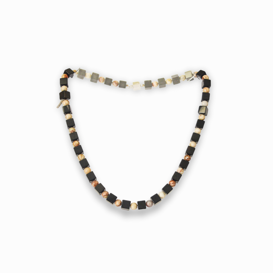 La collana 'Achátis' è realizzata con onice ed agata. Questa collana incarna l'eleganza nella sua forma più pura e minimalista, con un design che gioca sull'alternanza armonica di forme e materiali.