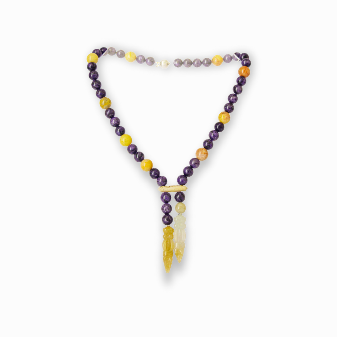 La collana 'Cara' è realizzata con giada charoite, una tipologia di pietra dalle sfumature di viola. Il punto focale della collana è il ciondolo, composto da due punte intagliate sempre di giada charoite, con sfumature che vanno dal verde chiaro al giallo.