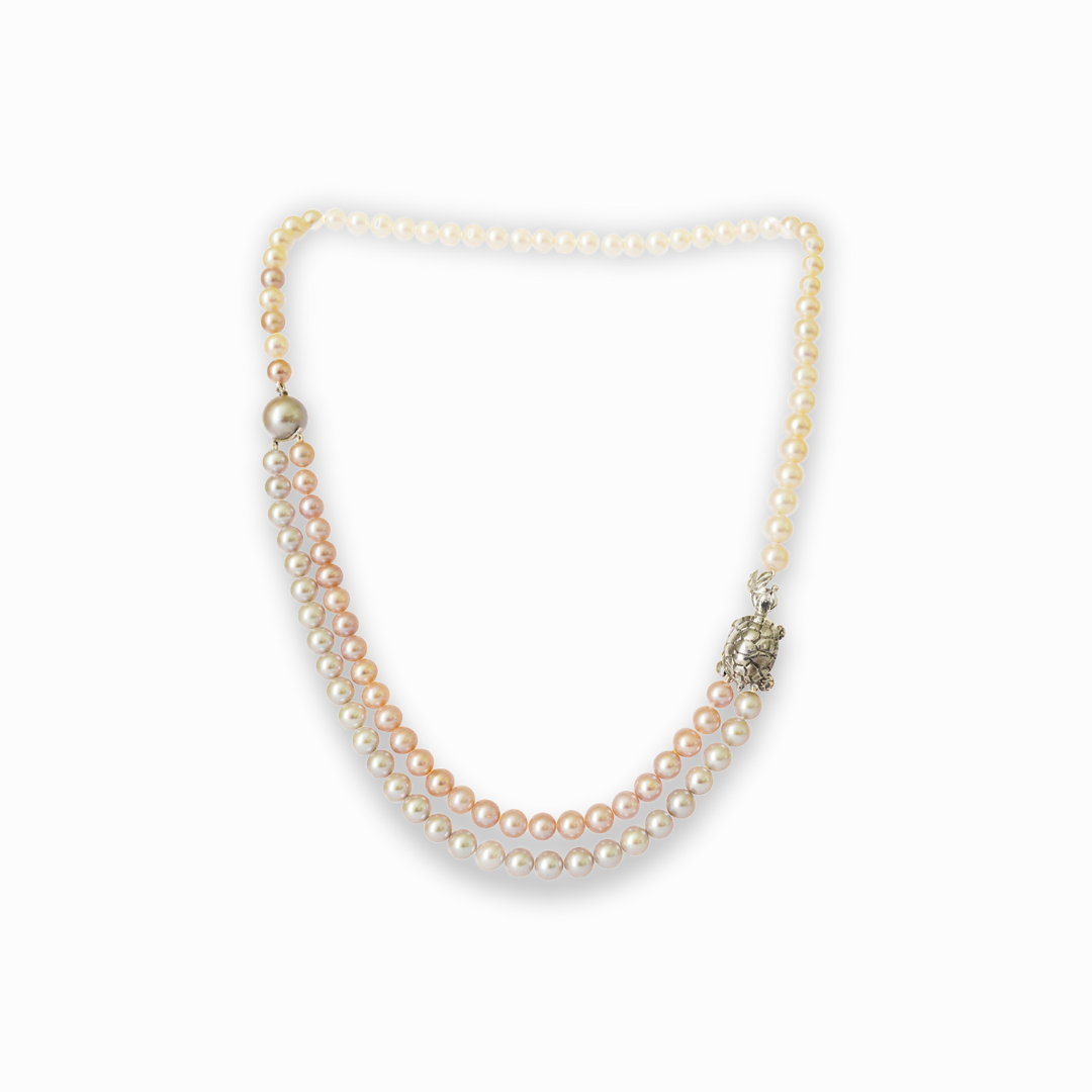 La collana 'Chelò' è realizzata con perle fresh water che riflettendo sfumature di bianco, crema e rosa. La chiusura è il tratto che più caratterizza la collana, una chiusura in argento 925 a forma di tartaruga.