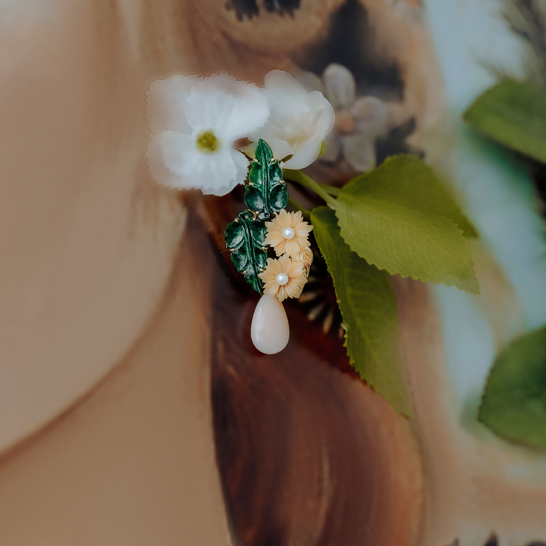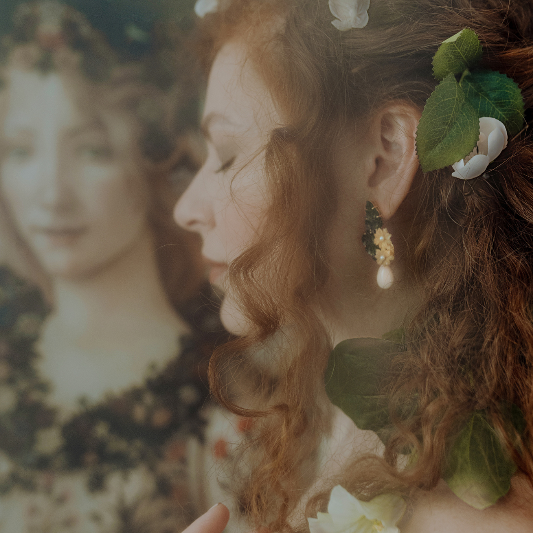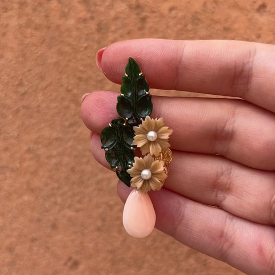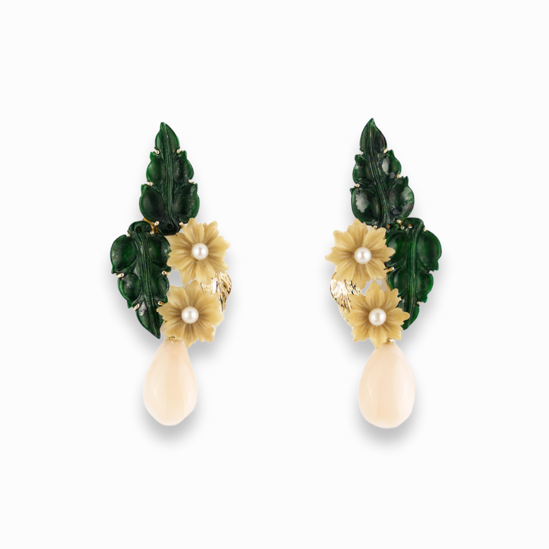 Gli orecchini 'Chlori' sono realizzati con giada, corallo, perle e tagua. L'ispirazione deriva dal dettaglio della ninfa Flora del famoso quadro rinascimentale, 'La Primavera' del Botticelli, che simboleggia la natura come forza universale. Gli orecchini infatti riprendono il nome greco della ninfa stessa.