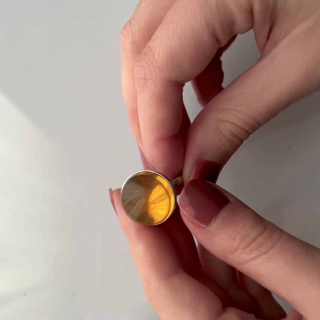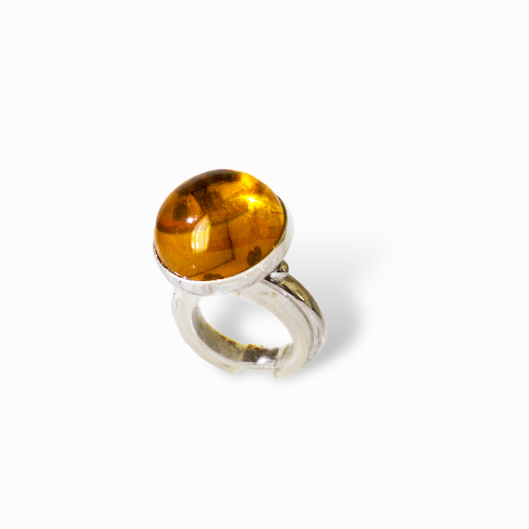 L'anello 'Kerì' è composto da una pietra d'ambra cabochon, la cui calda tonalità dorata cattura aggiunge un tocco di luce ed eleganza ad ogni abbinamento.