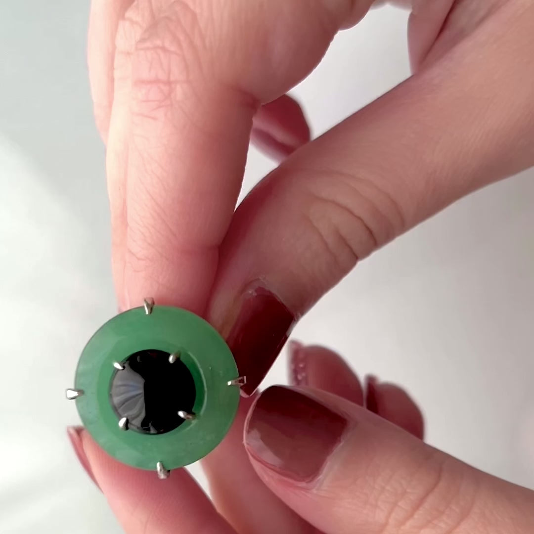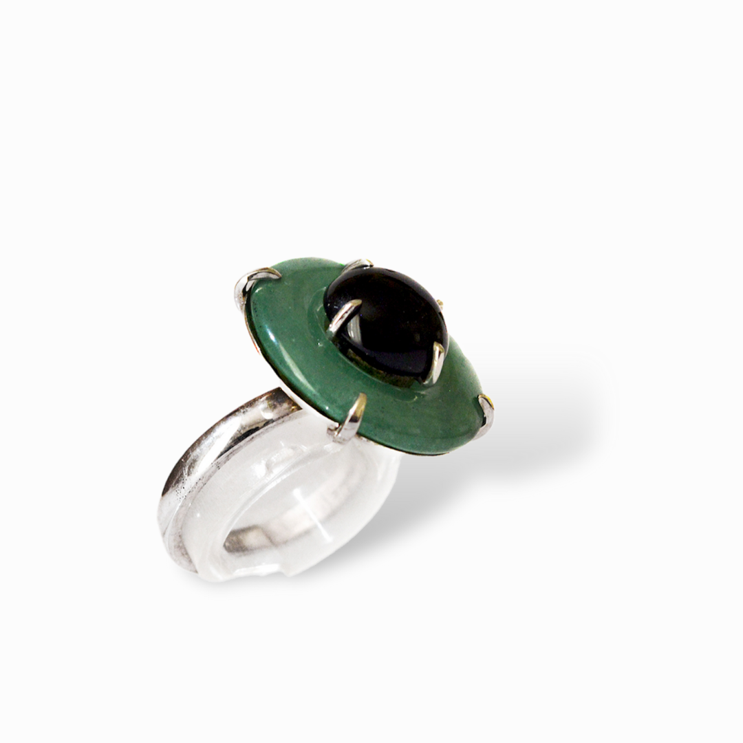 L'anello 'Ychas' è realizzato con avventurina e onice. La scelta di queste due pietre crea un pezzo di gioielleria dal design intrigante e raffinato. L'onice nero al centro serve come punto focale, offrendo un contrasto marcato rispetto al verde luminoso dell'avventurina. Esso rappresenta la scelta ideale per chi cerca un pezzo distintivo e di carattere.